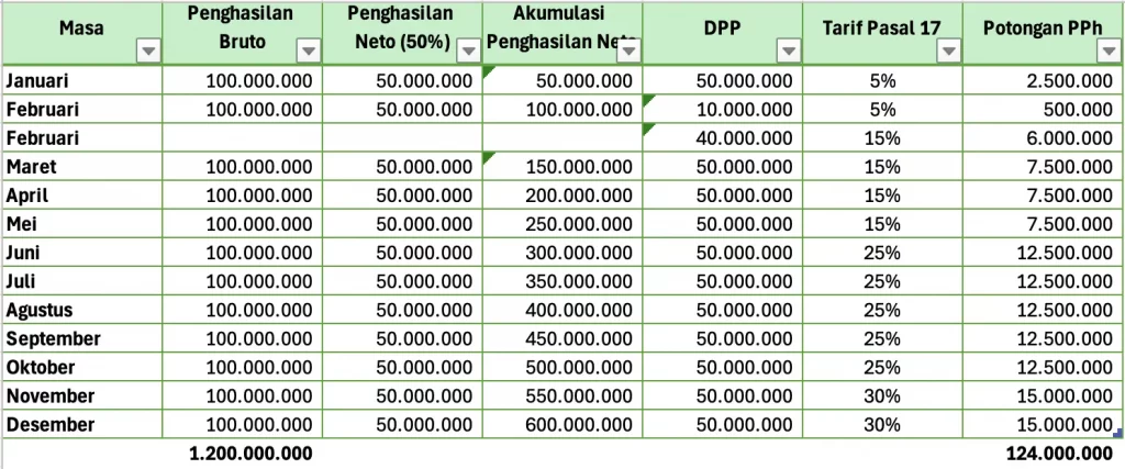 PPh Pasal 21 = Penghasilan Bruto x 50% x Tarif Pasal 17 (progresif) memperhitungkan akumulasi penghasilan pada bulan berikut nya.